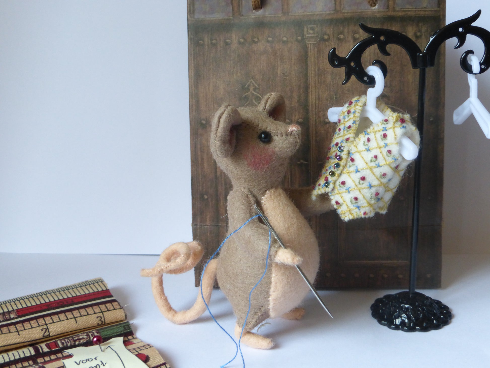 De kleermaker heeft een mooie gilet gemaakt, deze is door hem ook geborduurd. Voor de kapstok heb ik een oorbelhanger gebruikt maar je kunt ook een miniatuur houten kapstok hiervoor gebruiken.