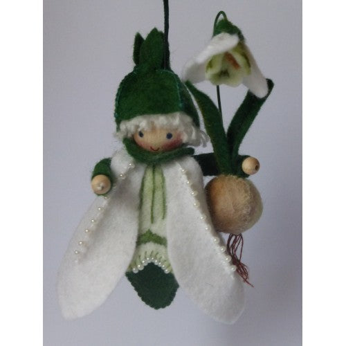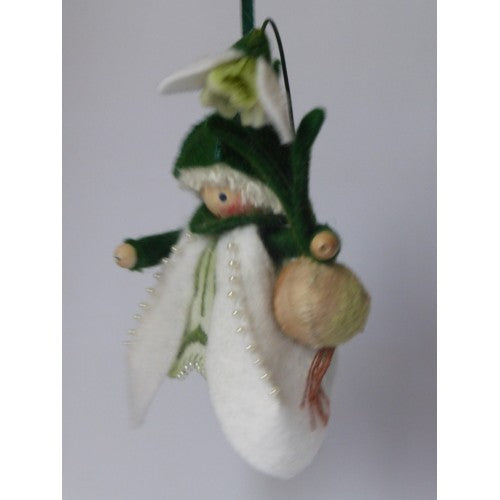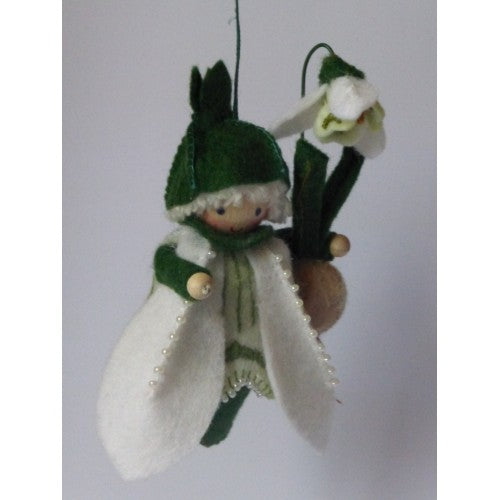 Het jurkje van dit bloemenkindje is het sneeuwklokje en in haar hand houdt ze een bolletje met sneeuwklokje vast.