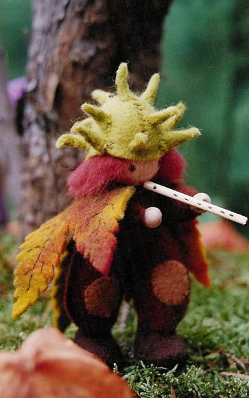 Het kastanje jongetje heeft een kastanje blad als cape. Hij blaast op een fluit.