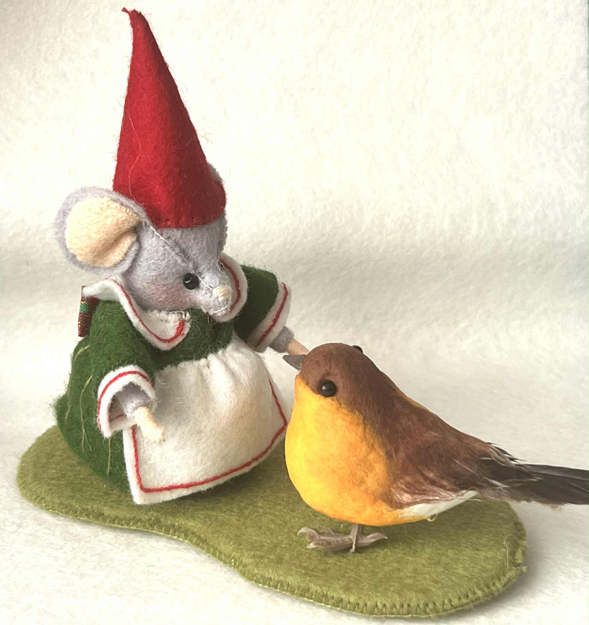 Het roodborstje is al kant en klaar en bij het muisje zit wat borduurwerk aan haar kleding. Je maakt ze samen vast aan een ondergrondje zodat ze goed blijven staan.