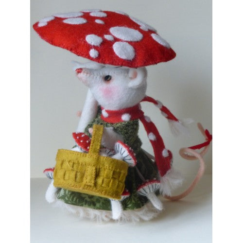 Ze heeft een ovale mandje in haar hand, ook gemaakt van vilt, met hierin kleine paddenstoelen, hoe kan het ook anders.