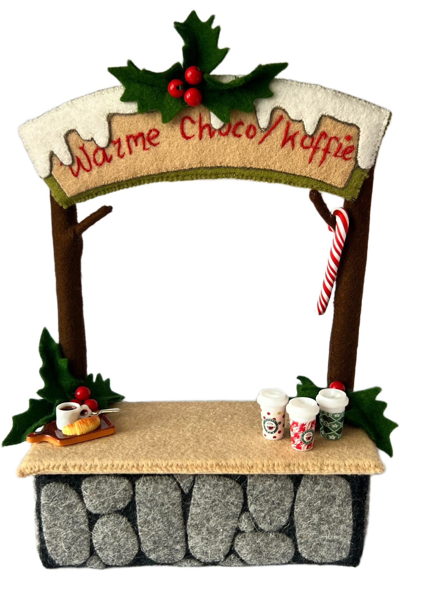 Deze leuke kraam hoort bij Noor en Floortje. Noor verkoopt warme drankjes zoals chocomelk en koffie. Ook kan je bij haar een ontbijtje kopen of wat lekkers. De kraam versiert met kerstgroen.